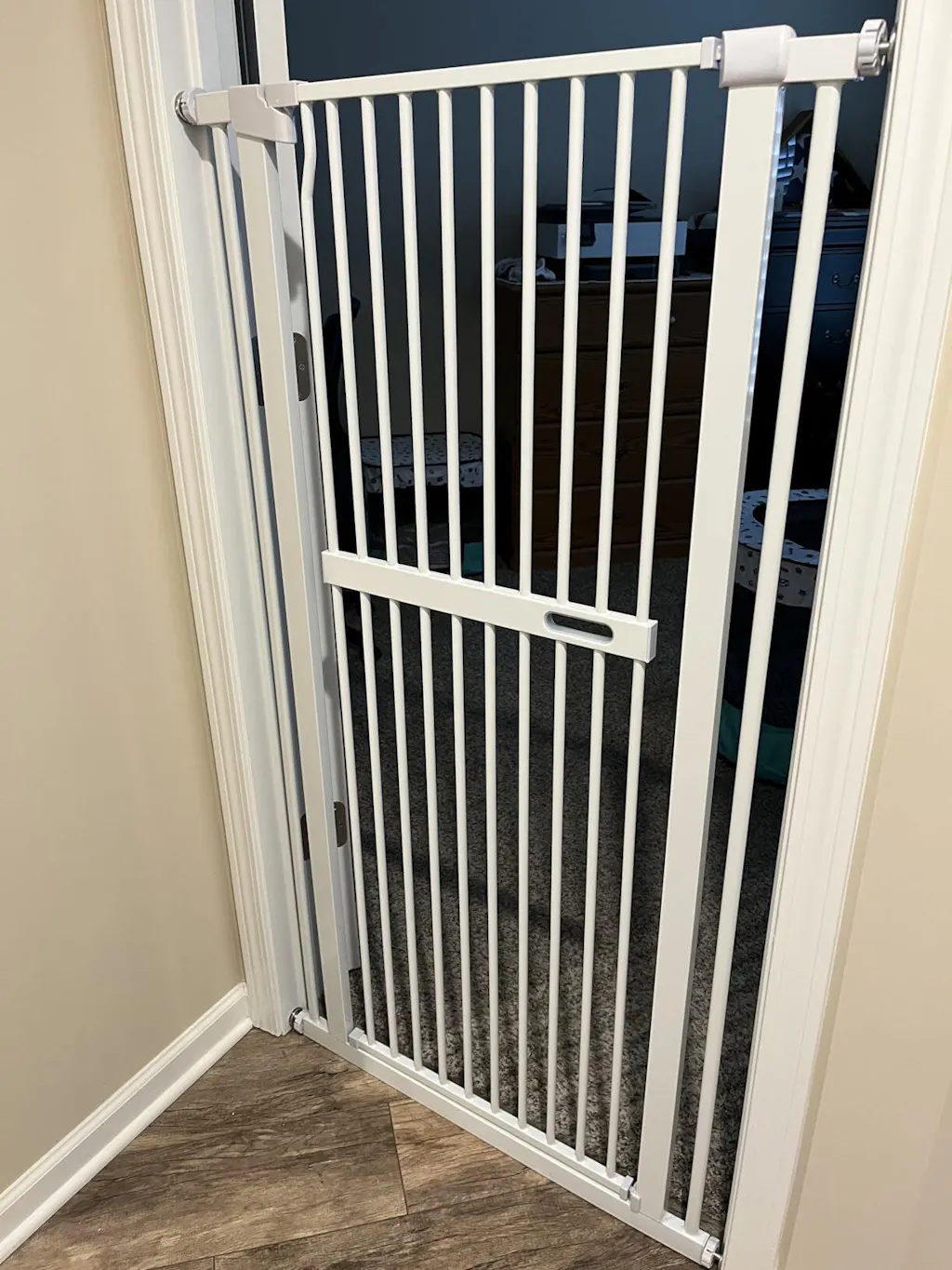 Whether you need a gate stairs pet or pet-proofing a specific room, this gate has you covered. It fits openings from 29.9 to 44.4 inches, with adjustable extensions included to customize the width. It is the ideal pressure mounted dog gate for doorways, hallways, and the bottom of stairs.